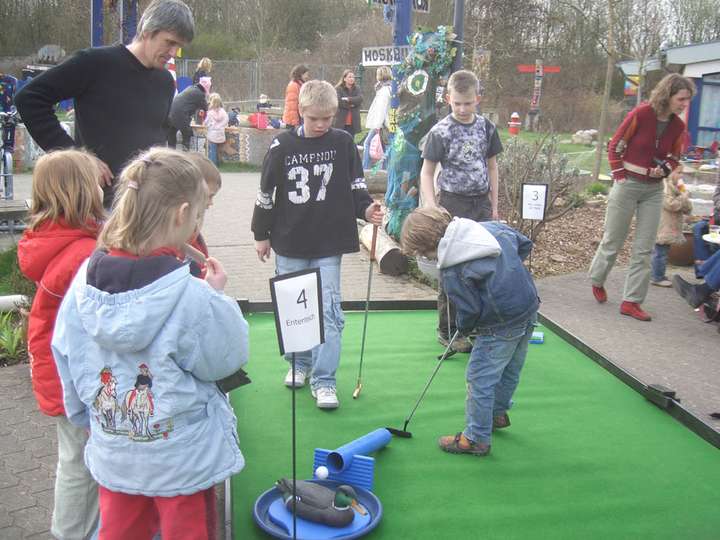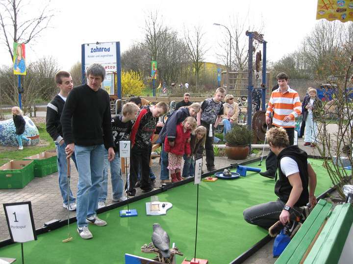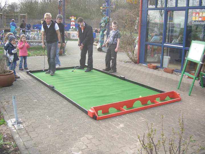 Fun-Minigolf ist eine mobile Kleingolfanlage mit ca. 18 m² Kunstrasenspielfläche, die auf jedem festen Untergrund aufgebaut werden kann. Gespielt wird nach den Regeln des Minigolf, wobei wie beim Golf auch die Kunstrasenfläche mitgenutzt wird. Die Spielstationen, in die die Spielenden den Ball schlagen, sind mit Tiermotiven versehen und haben unterschiedliche Schwierigkeitsstufen. Hier können sich auch geübte Golf-Profis immer wieder neu ausprobieren. Ein Teil der Spielfläche ist mit einer Zielfläche versehen, an der um die Wette gespielt werden kann. Insgesamt also ein Spielvergnügen für alle Altersklassen, Neulinge und Fortgeschrittene und ein dekoratives Spiel, welches viele Einsatzmöglichkeiten bietet.