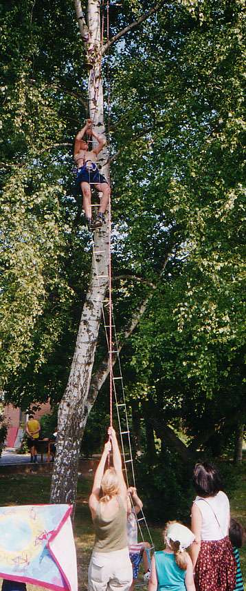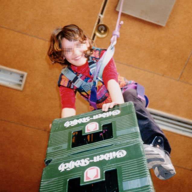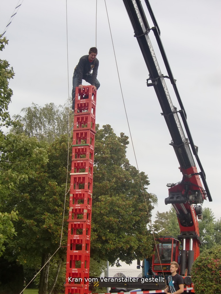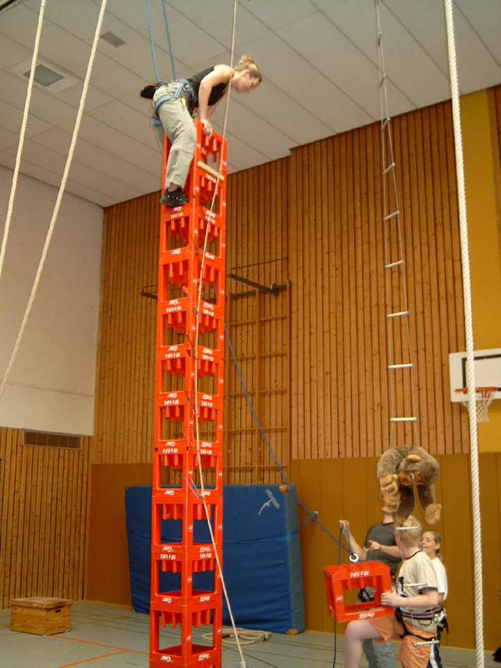 Das allseits beliebte Kistenklettern ist eine spannende Aktion, die von Kindern ab 6 Jahren, Jugendlichen und Erwachsenen durchgeführt werden kann. Dabei geht es weniger um sportliche Leistung, sondern um Selbstvertrauen, Konzentration und Körperbeherrschung. Die Kletternden stehen dabei im Blickpunkt des interessierten Publikums. Damit die Zuschauenden und andere Personen nicht von herunterfallenden Kisten getroffen werden können, benutzen wir eine spezielle Vorrichtung, die die Kisten im Falle eines Sturzes beinahe senkrecht herunterfallen lässt und somit ein weiträumiges Absperren des Bereiches überflüssig macht.
